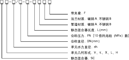 SCV型静态混合器:dh=5、DN80、PN1.6MPa、L=1000,不锈钢法兰,低碳钢管道,表示成SV-5/80-16-1000AB。