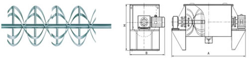 电机通过减速机带动螺条搅拌机构转动,一方面使物料产生上下移动,另一方面由于螺条的特性优点使物料产生内外对流,达到充分混合的目的,它有三种标准的搅拌设计—连续式螺条、打断式螺条和桨叶,分别根据中心或底部出料的要求来进行选择。