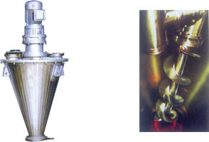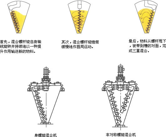 混合机筒体内螺旋轴的快速自转将物料向上提升,形成一股沿筒壁自下而上的螺柱形物流,同时,转臂带动螺旋轴作公转运动,使螺旋轴外的物料,不同程度进入螺柱包络线内,一部分物料被错位提升,另一部分物料被抛出螺柱,从而达到全方位物料不断更新与扩散,被提到上部的物料再向中心凹穴汇合,形成一股向下的物料流,补充了底部的空穴,从而形成对流循环,由于上下物料流动的复合,物料在短时间内获得了均匀混合,混合效率高。